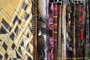 Nelle immagini: Bruno Boggia con la figlia Lucia ed alcune produzioni di foulards di seta.