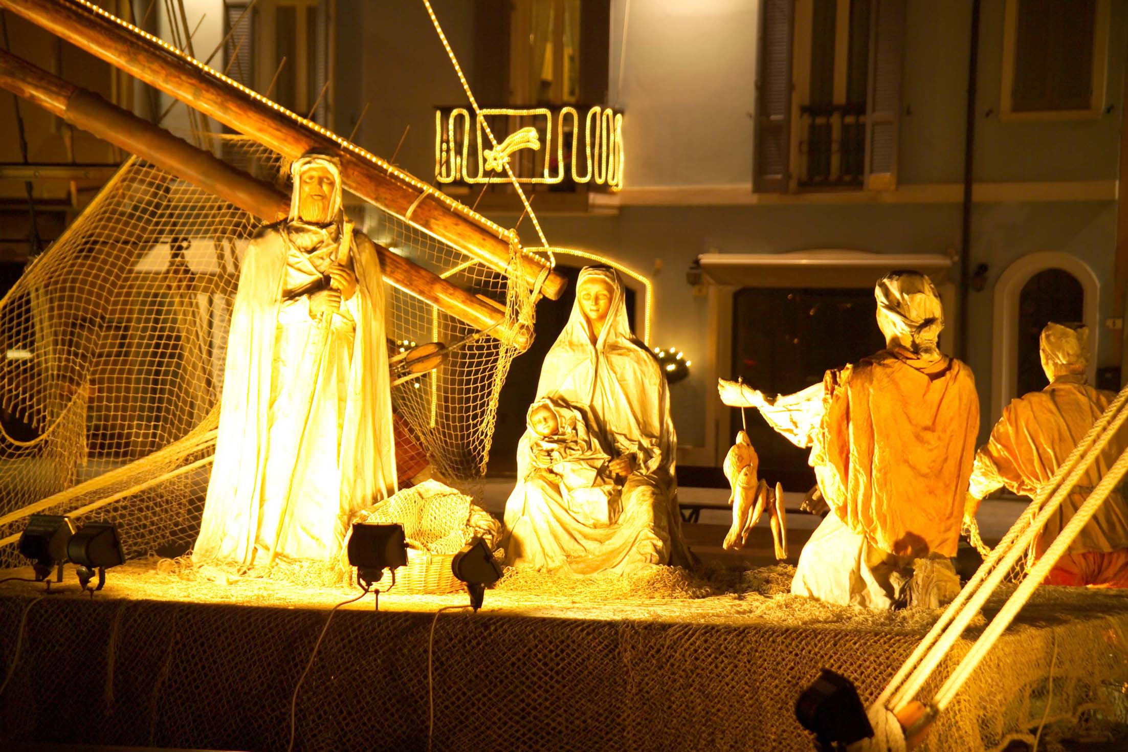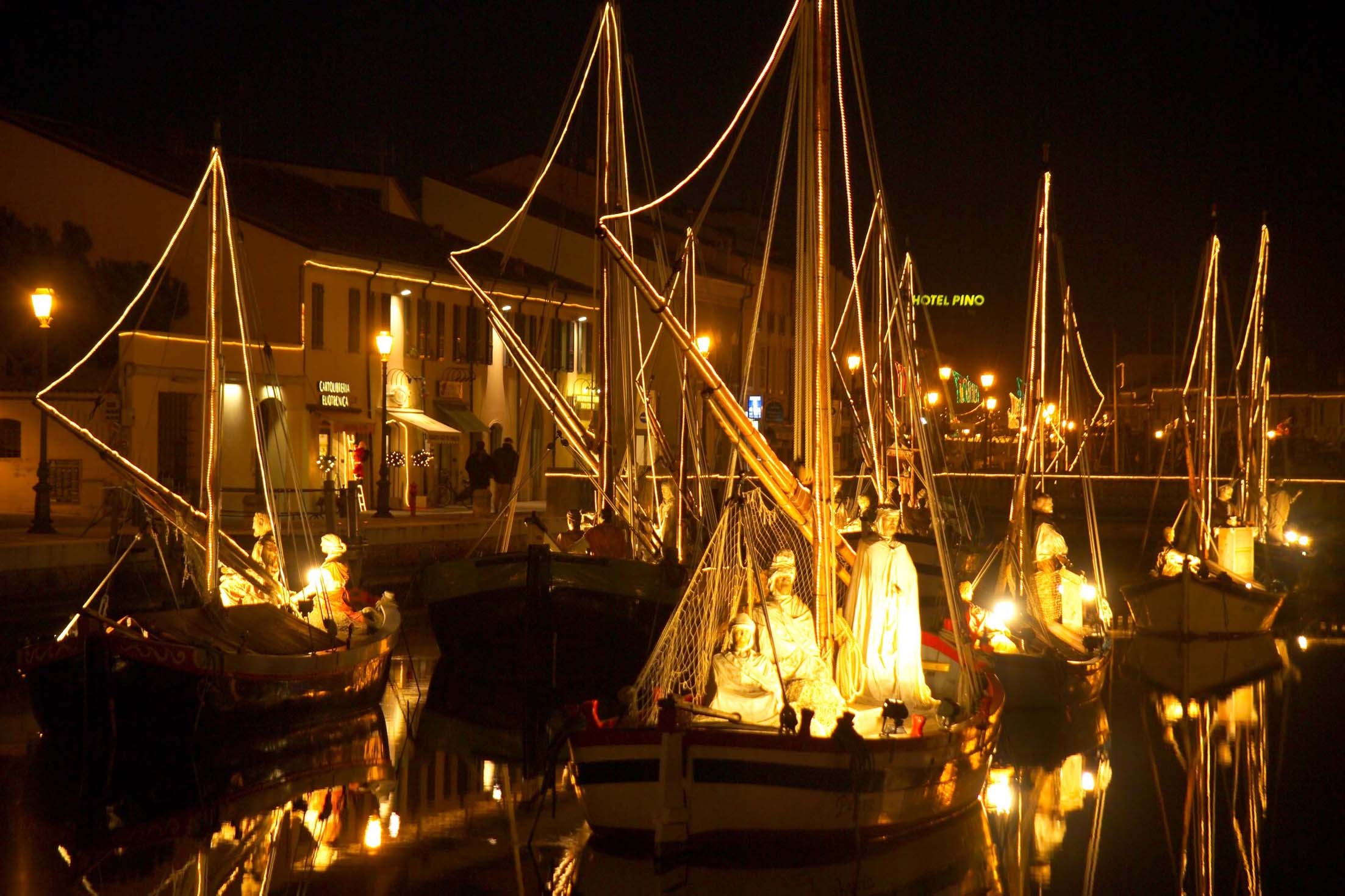 Cesenatico allestisce un Presepe che è unico al mondo: non ci sono grotte o capanne con i sentieri coperti di muschio, le cime innevate e le pecorelle al pascolo a fare da sfondo alla Natività, bensì Bragozzi, Battane, Lance, Trabaccoli Paranze e Barchét, le antiche e coloratissime imbarcazioni dell’alto e medio Adriatico. Nella romantica cornice del porto canale leonardesco le antiche imbarcazioni del Museo della Marineria ospitano la Sacra Famiglia, i Re Magi e tutti gli altri personaggi del presepe, e qui, accolto da tre delfini scolpiti, la notte di Natale, nascerà il Bambino. A fare da sfondo c’è la città con lo scorcio suggestivo delle antiche Conserve e delle case colorate che si specchiano nell’acqua del porto canale.