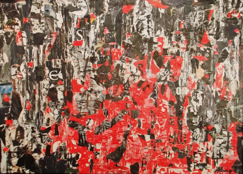 This work – “Bloody Asphalt” – is dedicated to road victims and it supports the “30.000 lives to save” campaign. It’s not a canvas reproducing details from torn posters images, but it’s a collage I’ve created with hundreds of paper pieces from decomposed and ripped publicity posters I’ve collected along the streets… Black and red are the pre-eminent colors suggesting a road scene after  an accident. Abstract and reality to raise attention for an important  cause…