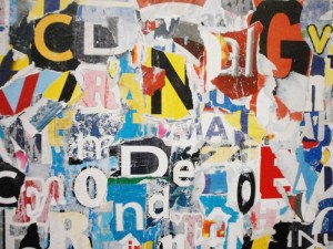 “LOST WORDS” COLLAGE BY ROBERTO ALBORGHETTI – CREATED WITH 400 PIECES OF WASTE-PAPER FROM TORN PUBLICITY POSTERS