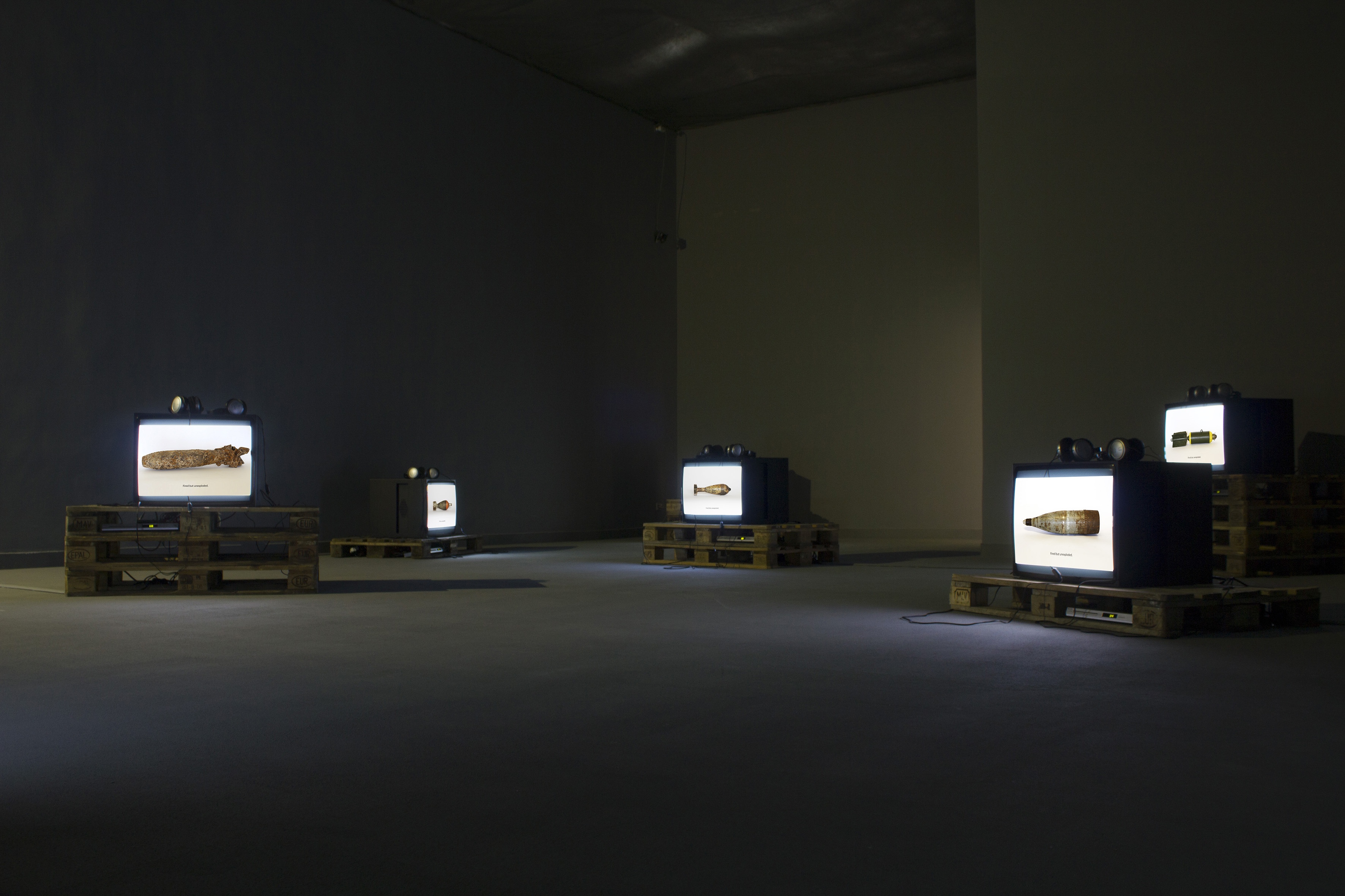 The installation comprises sixteen videos, each presenting an unexploded projectile found in Hungary. The vision of the destructive weapons, which hover in a homogeneous, indefinite space, is complemented with the sounds of the world around them, and thus the films open the way to new narratives.
