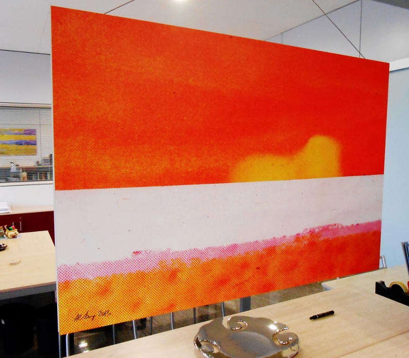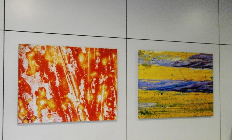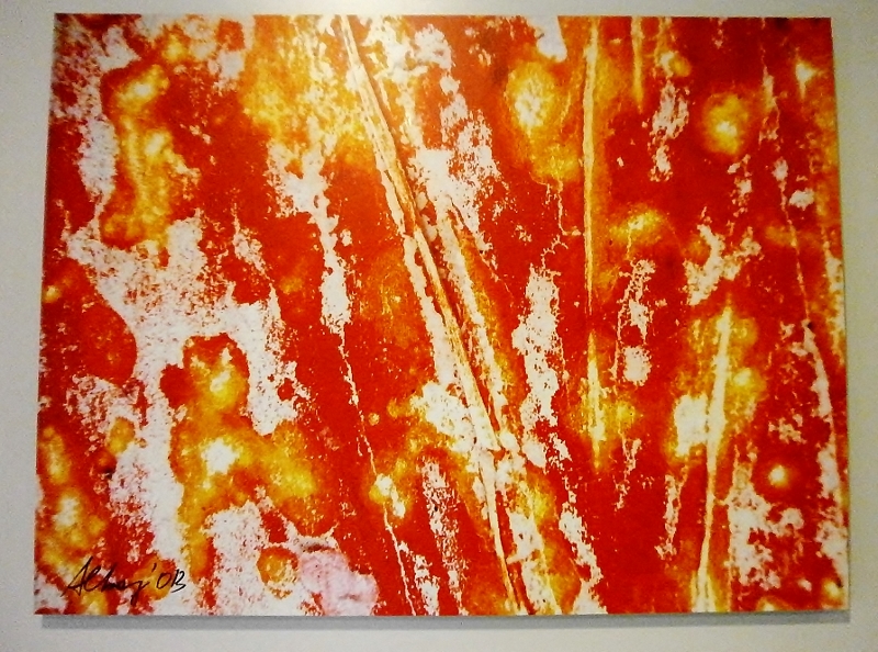 After being re-produced on canvases, lithographic prints and textiles (silk and cotton), my images about decomposed publicity posters, cracks and “road signs” have found a new way to be showned and represented. Now they are on aluminium plates… Aluminium metal gives brilliancy, depth and strenght to colors and shapes, reaching chromatic effects and emphasizing textures “as an unmistakable complement of interior design and decoration…”
