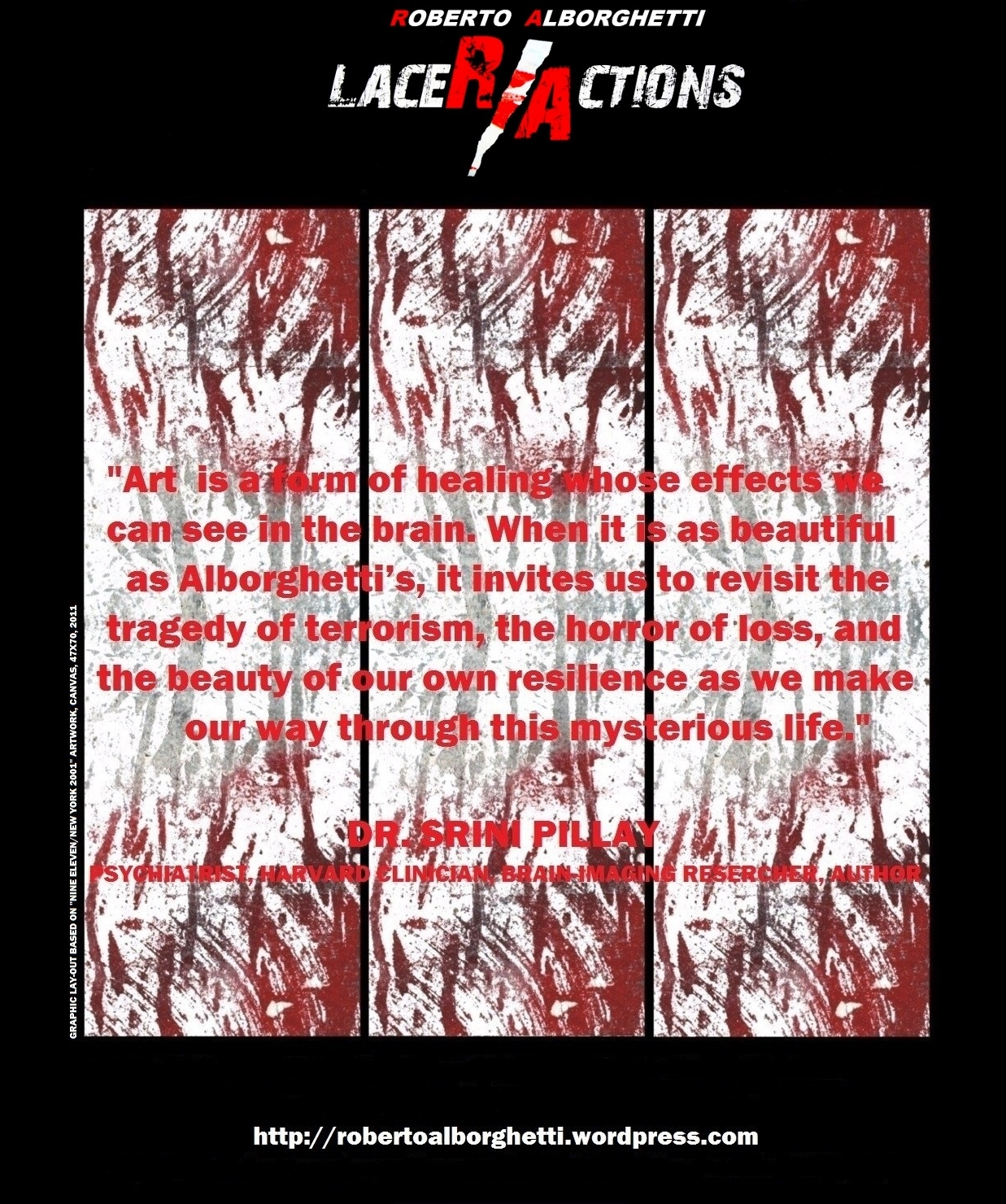 “When we think of art representing tragedy, it raises all kinds of questions.  Can we really make art of an experience where people have lost loved ones?  Can we truly justify directing people toward beauty when there is such tragedy?  The beauty of abstract art – and of Alborghetti’s art in particular, is that it is in invitation for us to project what we will onto the piece.  We do so anyway – even when human forms, gardens and ponds protect us with their explicit forms in Impressionist and Renaissance paintings.  Art, as I substantiated above, is a form of healing whose effects we can see in the brain. From a psychological perspective, art is an amazing way to mourn.  When it is as beautiful as Alborghetti’s, it invites us to revisit the tragedy of terrorism, the horror of loss, and the beauty of our own resilience as we make our way through this mysterious life”.