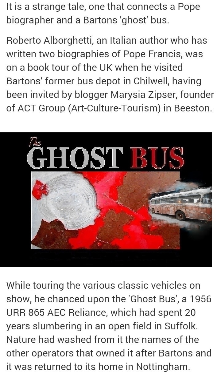 THIS IS THE STORY THAT “THE NOTTINGHAM POST”PUT ON LINE ABOUT “THE GHOST BUS” ART PROJECT. THE SHORT FILMS PREMIERE IS SCHEDULED AT BARTONS PLC, CHILWELL NOTTINGHAM, ON FRYDAY MARCH27, 2015, PROMOTED AND ORGANIZED BY BARTONS PLC, ACT GROUP, ROBERTO ALBORGHETTI (LACER/ACTIONS).
