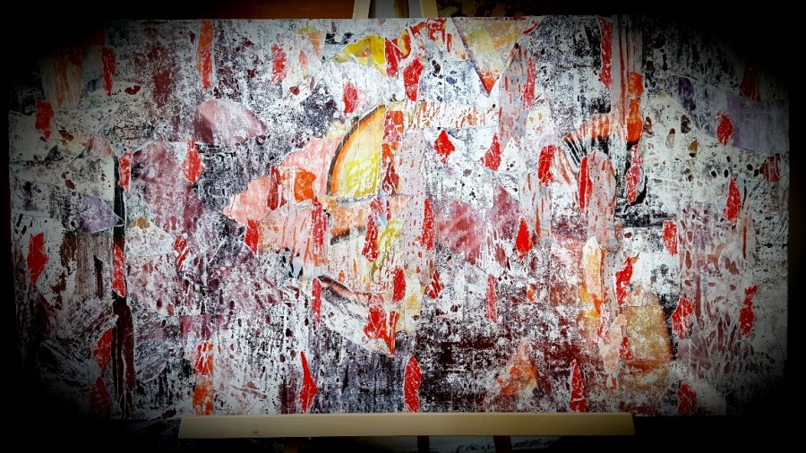 Global Warming, Global Warning…The world is burning! Collage made on wood with about 600 pieces of waste paper of decomposed publicity posters. Sizes: 110 x 57 cms. Created by Roberto Alborghetti for Lacer/actions project-research.