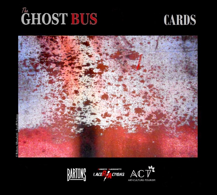 As you see above, the last 5 cards comes from The Ghost Bus project, promoted in Nottingham (UK) with ACT Group (founded by Marysia Zipser) and Bartons Garage: “A visual adventure in the Land of Robin Hood”. I discovered the Ghost Bus in Beeston, at Bartons huge garage of vintage buses and cars. I was really impressed by one of the oldest buses, a piece of history of English public transport: it’s a URR 865 vehicle AEC Reliance made in 1956! Simon Barton told me that a vehicle-sister of the “ghost bus” was documented in 1959 on a wonderful and unmissable film telling a beautiful journey through Italy by a group of English ladies and gentlemen. So, I took lot of macro photos around and inside the “ghost bus”… So, we began this wonderful “visual adventure in the Land of Robin Hood“. The project includes events, short movies for public performances and video shows, a cards series (reproducing 16 artworks selected from the 109 ones that has been created) and a collection of canvases and much more.
