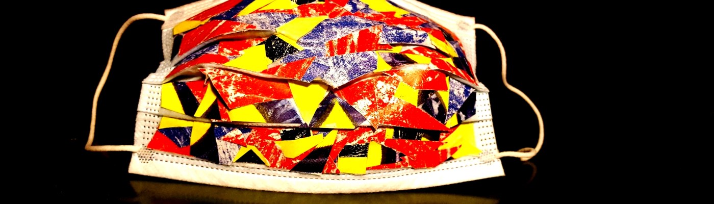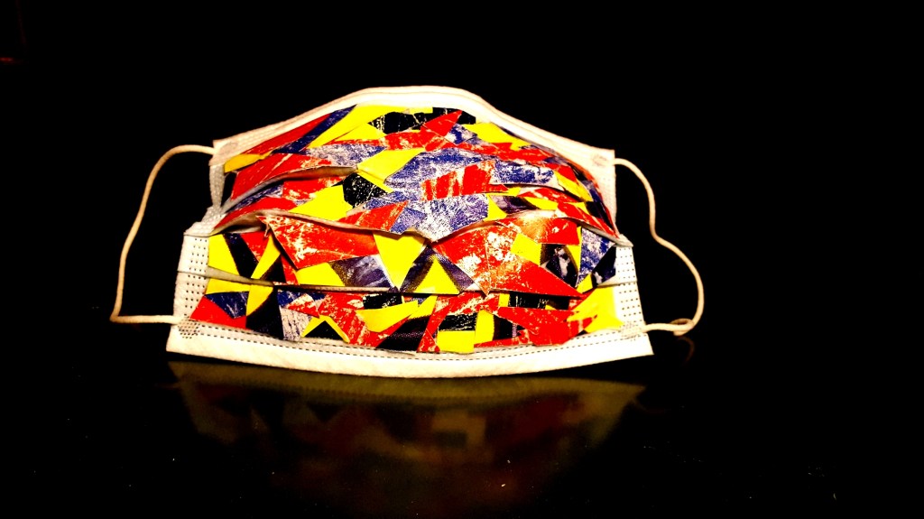 Da questi pensieri è nato questo progetto “Vorticism:Lockdown”. Mi sono tuffato nel vortice dei colori dei manifesti pubblicitari decomposti e corrotti, per trarre qualcosa di nuovo, qualcosa che aprisse le ali della speranza. Un manifesto pubblicitario strappato e logoro, scaduto nel suo messaggio, è l’immagine di questi tempi travolti dalla furia del virus. Io, innamorato del vorticismo, mi sono lasciato trasportare dal vortice di forme e colori. Ho de-strutturato strisce di carta straccia e le ho ri-strutturate in 3 piccole opere. Li chiamo collage. Ve li ho presentati, con immagini e videoclip. Oggi, il quarto lavoro rappresentata il simbolo di queste giornate di pandemia: la maschera protettiva, che ho immaginato nel design di un vortice di colori primari.