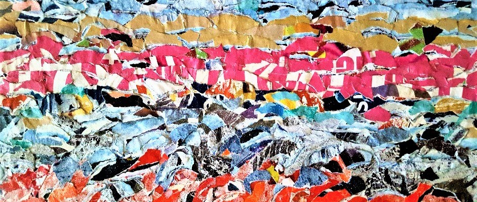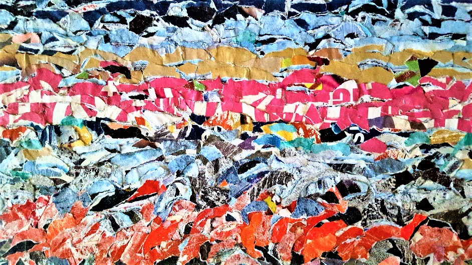 “It comes and goes in waves and carries us away…” is a quote from “Waves” song recorded by Dean Lewis on his album “A place we know”. Lewis is an Australian singer-songwriter and is best known for his 2016 single “Waves“, which was certified 7× Platinum in Australia in 2020; see the track list at: A Place We Knew (CD) – Dean Lewis AU Official Store (deanlewismusic.com) . The phrase fits very well with my artwork “Letting me go on Waves“, which is a collage made on a little table; its sizes are 108×51 cms. This work was created with more than 1.200 small paper pieces collected along the streets as waste material from outdoor torn and decomposed publicity posters. The compositional process is articulated in the phase of de-construction of the paper material (collected at the billboards) and its re-composition in a unitary scene using small pieces of waste paper.