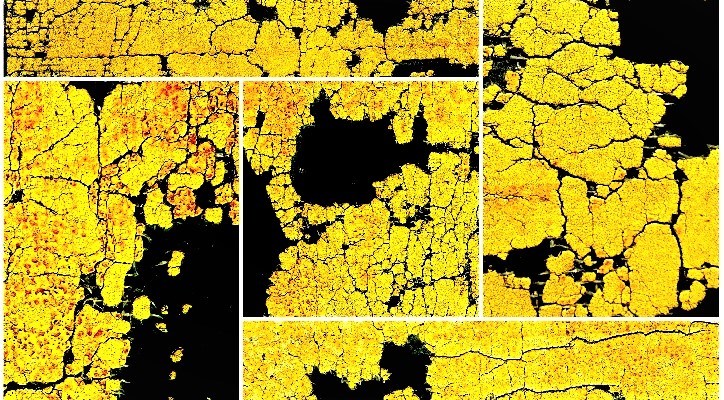 I have found a way to see them in another way. That is: taking a close-up photograph when they are damaged and worn. Exciting “pictures” come out. They look like maps of a territory seen from from the top of a satellite… But obviously they are not paintings, but macro photographs for my “Lacer / Actions” project.