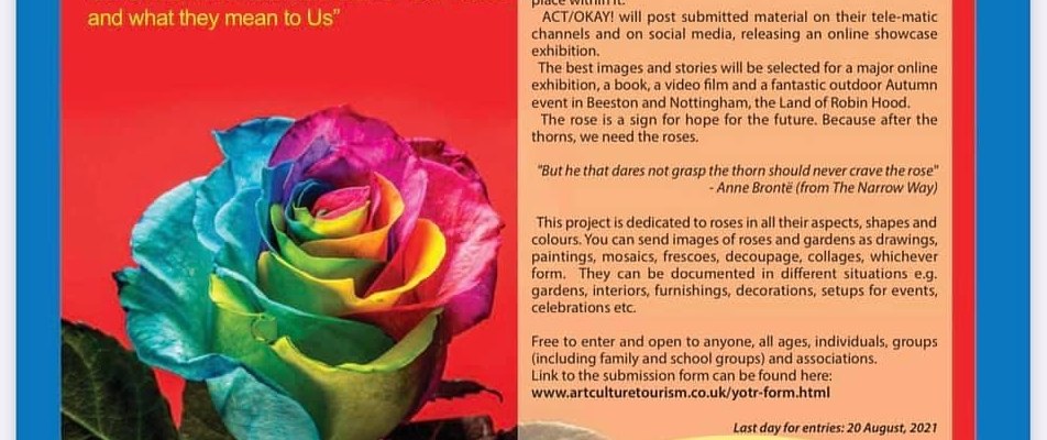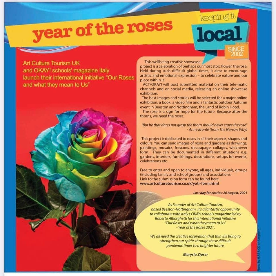 Notts TV Ey Up Show – 8.4.21 – presents the initiative Year of The Roses 2021 promoted by ACT/OKAY! Italy schools magazine. Invited to the studio is Marysia Zipser, Founder of Art Culture Tourism / ACT, together with Jeanie Barton who has composed and recorded the wonderful theme song. Roses video produced by Roberto Alborghetti. For more information about this project ‘Our Roses and what they mean to Us’ and how to participate by uploading your images and stories, please go onto http://www.artculturetourism.co.uk and YearoftheRoses page.
