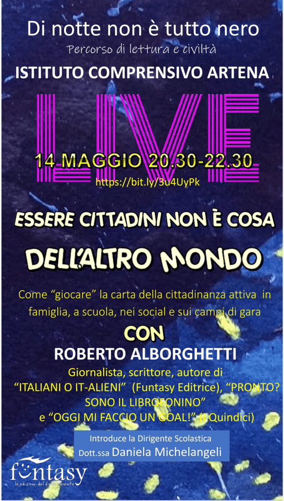 Sarà una super-serata aperta a tutti, online. Per dire che “di notte non è tutto nero”. Una serata che si propone come un percorso di lettura e civiltà. Si tratta dell’iniziativa in Live streaming promossa dall’Istituto comprensivo di Artena, Roma (Via G. di Vittorio 1), diretto dalla DS dott.ssa Daniela Michelangeli. “Essere cittadini non è cosa dell’altro mondo / Come “giocare” la carta della cittadinanza attiva in famiglia, a scuola, nei social e sui campi di gara”: questo il tema dell’evento in programma venerdì 14 maggio, dalle ore 20,30, nel contesto di una sorta di “Notte Bianca del Libro”, aperta alla partecipazione di tutti, allievi, famiglie, cittadini, rappresentanti di enti ed associazioni.