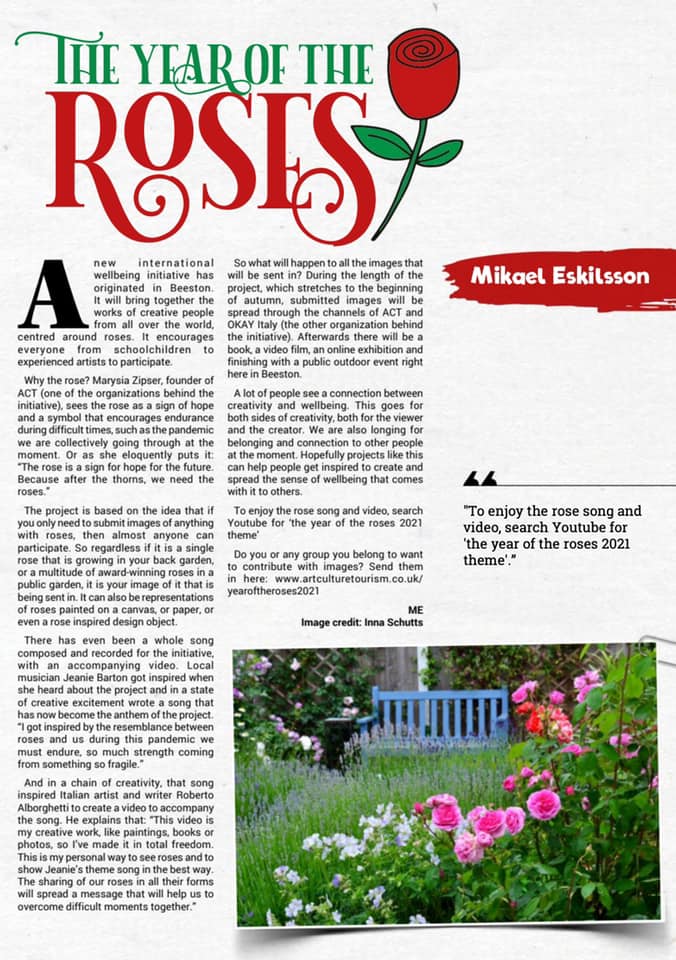 Many thanks to The Beestonian Magazine for publishing Mikael Eskilsson’s (ACT Digital Consultant, Sweden) article about #yearoftheroses2021 international initiative. The story wants to remind us of the international event promoted by ACT Art Culture Tourism (UK) and Okay! magazine (Italy)! Be part of our Roses wellbeing experience dedicated to the Queen of Flowers! Please send your photos of roses with a description of what they mean to you. Closing date: 30 September 2021.