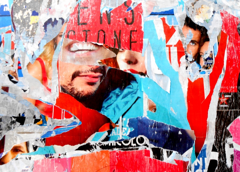 Those “tears” of posters, “re-created” by Roberto Alborghetti, have become true artist’s paintings: at first glance they can be attributed to contemporary avant-garde painters, with authentic and precise messages on which our attention should linger. The observers may see in these paintings blue skies and seas, beautiful sunrises and sunsets: the scenery would call “bucolic” and so on. All this with a clear and understandable “language”.