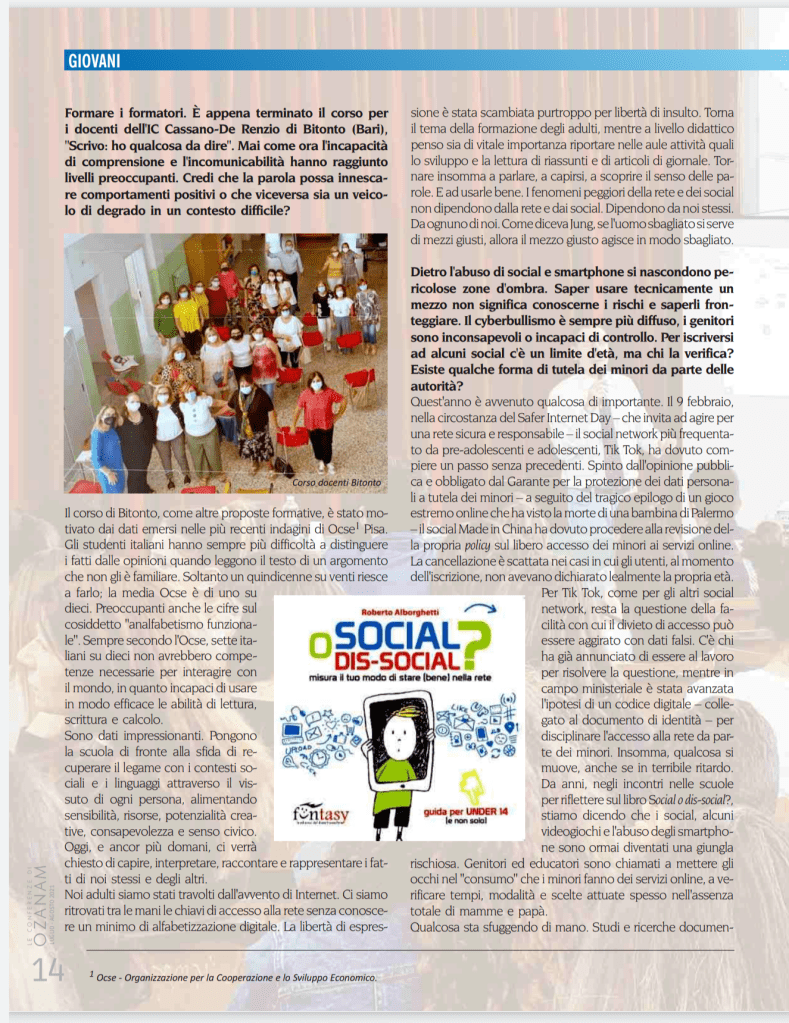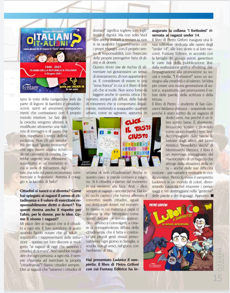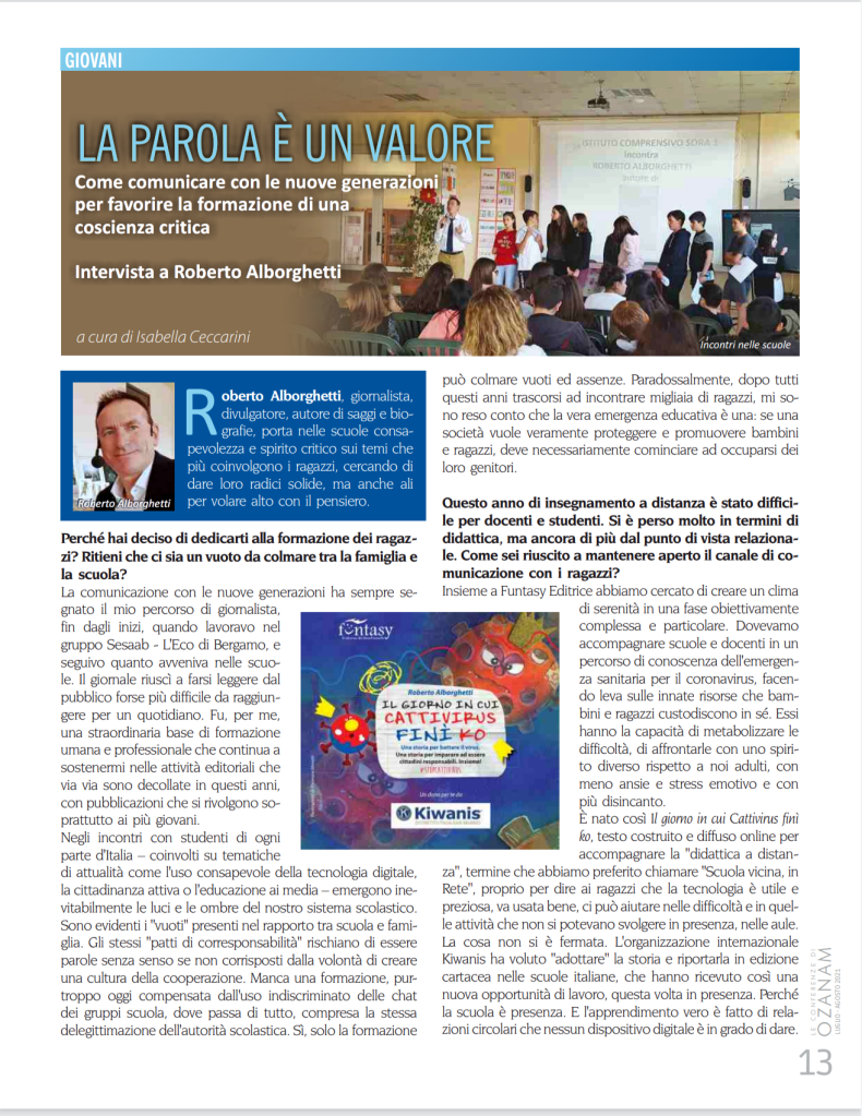 “La parola è un valore”. Comunicazione, linguaggi, alfabeti e formazione – con riferimento alle attività editoriali e ai progetti di Funtasy Editrice – nelle tre pagine di intervista che Roberto Alborghetti, giornalista, scrittore e formatore, ha avuto con la giornalista Isabella Ceccarini per il nuovo numero della prestigiosa rivista Le Conferenze di OZANAM. Sono spunti di riflessione, utili per i docenti, i formatori, le famiglie.
