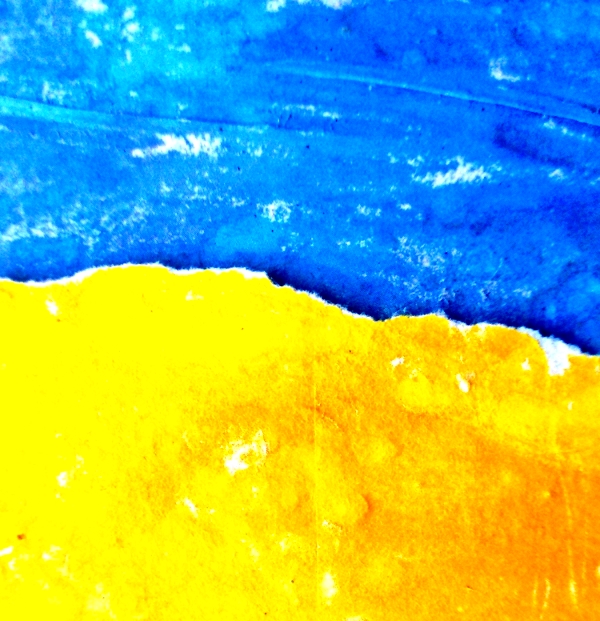 La bandiera dell’Ucraina è stata adottata nel 1918, e viene interpretata come il cielo blu (simboleggiante la pace) sopra i campi di grano (simboleggianti la prosperità). I colori azzurro e giallo utilizzati dall’Ucraina dopo la riconquista dell’indipendenza hanno origine dalle insegne dei principati medioevali (XIII secolo) e dallo stemma dell’eroe nazionale Bogdan Chmel’nickj. Durante il dominio sovietico questa bandiera venne vietata. E purtroppo la storia si ripete, con la Russia di Putin che ha aggredito uno Stato sovrano. Facciamo in modo che i colori dell’Ucraina sventolino in alto, in tutti i modi. Come in questa macrofotografia che, parte del mio progetto-ricerca “Lacer/azioni”, fa riferimento alla carta stracciata di un manifesto di pubblicità.