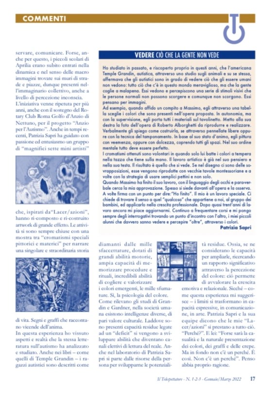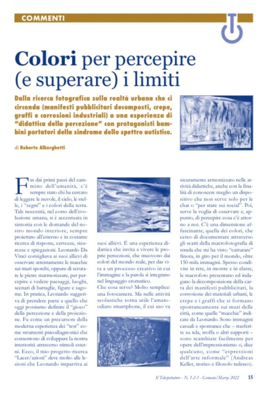 “Colori per percepire (e superare) i limiti”. Il nuovo numero della rivista “Il Telespettatore” pubblica un mio articolo su didattica della percezione e della proiezione. Nelle 3 pagine c’è il reportage della mia esperienza di ricerca, non solo fotografica, e il racconto dello straordinario “Atelier del Colore e delle Emozioni” che, con Patrizia Sapri, coinvolge bambini portatori dello spettro autistico. “Il Telespettatore” è diretto da Maria Elisa Scarcello ed è pubblicato da AIART-Cittadini Mediali https://www.aiart.org/
