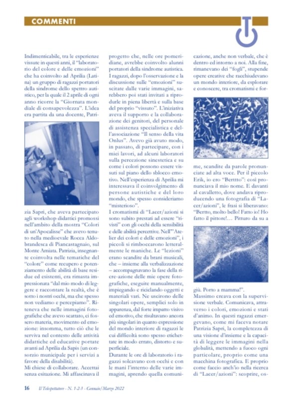 “Colors to perceive (and overcome) the limits”. The new issue of “Il Telespettatore” magazine publishes an article of mine on the Didactics of perception and projection. In 3 pages there is a reportage of my research experience, not only photographic, and the story of the extraordinary “Atelier of Color and Emotions” which, with Patrizia Sapri, involves children with the autism spectrum.