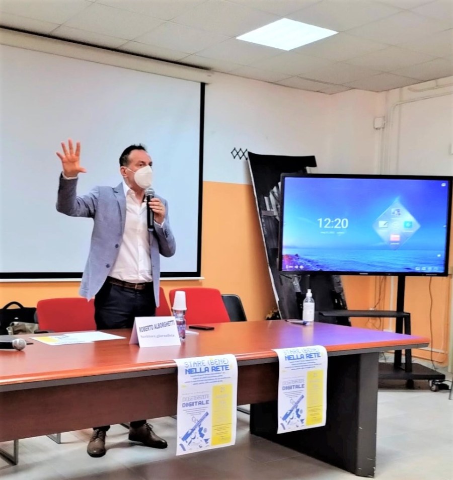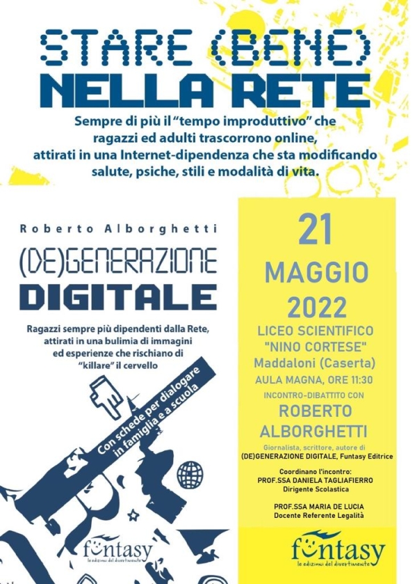 Ma è proprio vero che il maggior uso dei dispositivi elettronici porta ad una crescita delle competenze digitali? Perché si passa sempre più tempo in Rete? Quali sono gli elementi che scatenano la cosiddetta dipendenza digitale? Cosa spinge il 70 per cento dei minorenni ad avere profili sui social basati su dati anagrafici falsi? Tante le domande che sabato 21 maggio si sono rincorse a Maddaloni (Caserta) nell’Aula Magna del Liceo Scientifico Nino Cortese, dove Roberto Alborghetti ha parlato del suo nuovo libro “(De)generazione digitale”, Funtasy Editrice.