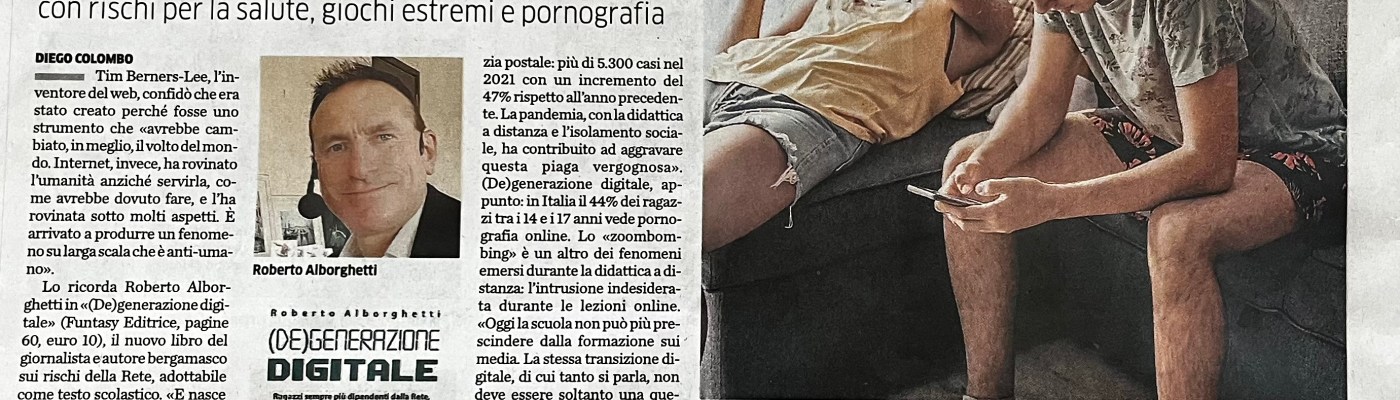 Il quotidiano “L’Eco di Bergamo” dedica ampio spazio ed attenzione alla presentazione del libro di Roberto Alborghetti, “(De)generazione digitale”, grande novità di Funtasy Editrice. Il giornalista Diego Colombo, in una intervista con l’autore, illustra con efficacia e puntualità i contenuti della pubblicazione che si rivolge a docenti, genitori, educatori ed istituzioni che operano negli ambiti culturali, sociali ed educativi. “Ragazzi sempre più dipendenti dal web: gli educatori vigilino”: questo il titolo del servizio giornalistico.