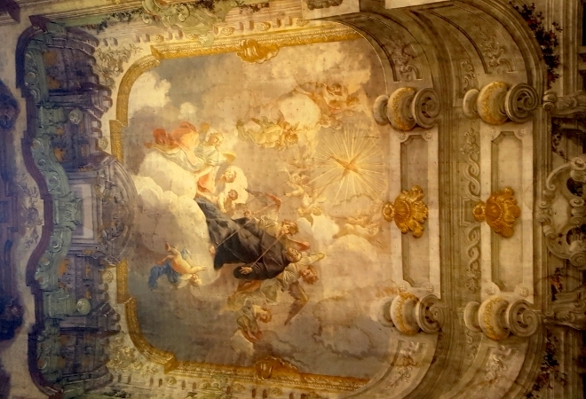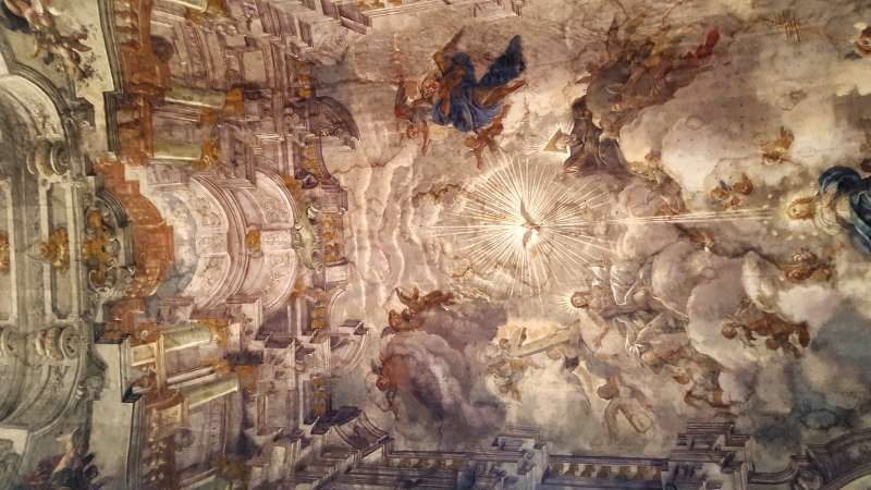 The great project of the canvas was commissioned in the same period in which the works for the Royal Palace of Caserta began, in a period of great economic and cultural ferment. The canvas appears to be seamless and covers the imposing rectangular hall. The three allegories of the Triumph of Faith over Heresy are depicted among the perspective games that illusively and vertically enlarge the space of the room. It is a pictorial and visual “deception” of great effect and impact.