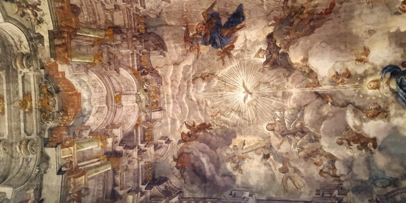 The great project of the canvas was commissioned in the same period in which the works for the Royal Palace of Caserta began, in a period of great economic and cultural ferment. The canvas appears to be seamless and covers the imposing rectangular hall. The three allegories of the Triumph of Faith over Heresy are depicted among the perspective games that illusively and vertically enlarge the space of the room. It is a pictorial and visual “deception” of great effect and impact.