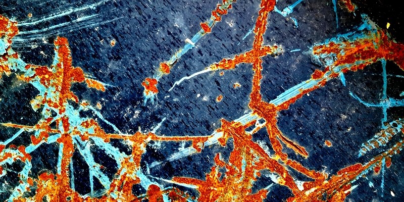 I don’t know if now the big blue steel container is still in the place where I saw it. Maybe not. On that day it was located in the large square in front of the ARC Cinema Beeston, where construction work was in progress. The large metal case was marked with scratches, cracks, corrosion and rust. Just enough to catch my interest: I took macro photos and close-ups.