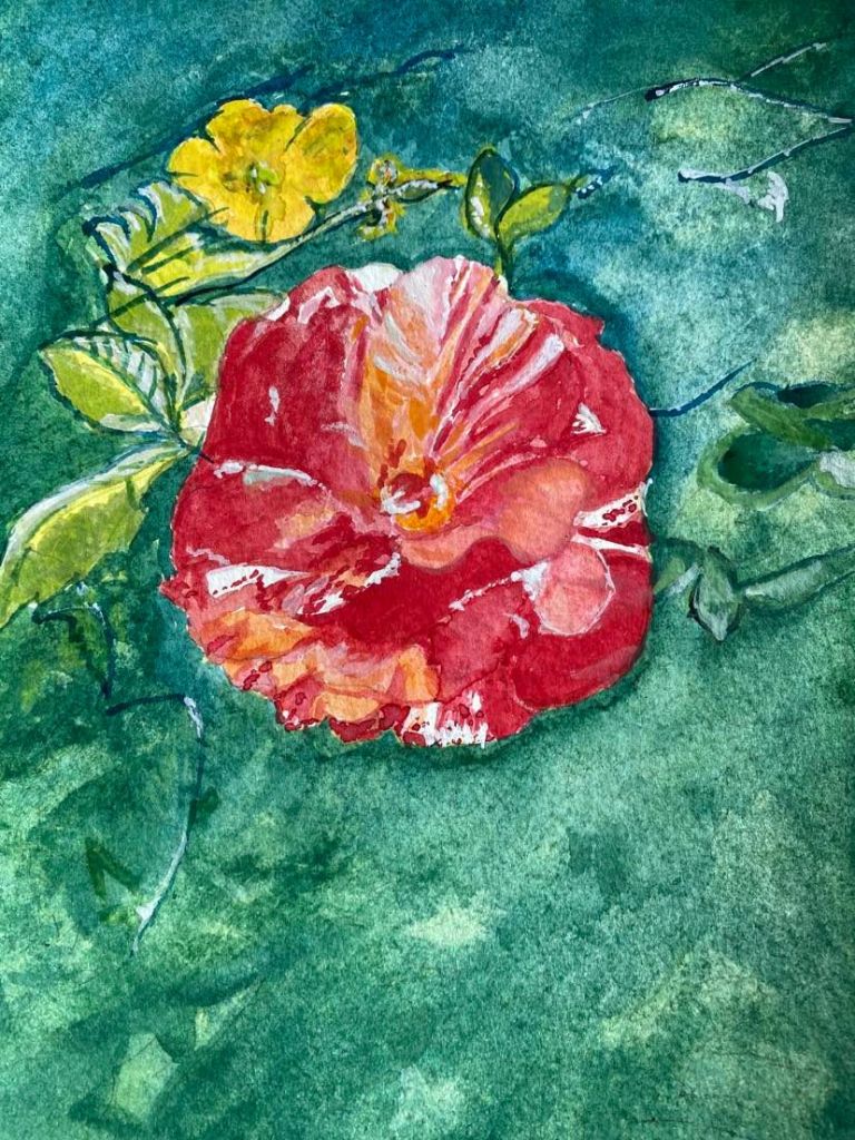 Here is my watercolour attempt referenced to a Hanky Panky rose photo print I took five years ago in my garden. I’ve only had five short watercolour classes from Beeston watercolourist and teacher Anjana Cawdell. Also I attach two other photos taken in my garden today.