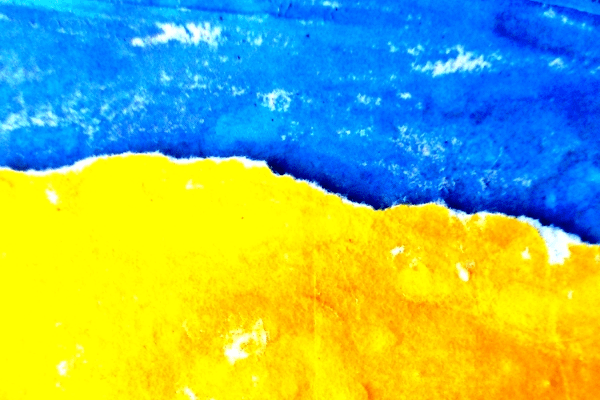 La bandiera dell’Ucraina è stata adottata nel 1918, e viene interpretata come il cielo blu (simboleggiante la pace) sopra i campi di grano (simboleggianti la prosperità). I colori azzurro e giallo utilizzati dall’Ucraina dopo la riconquista dell’indipendenza hanno origine dalle insegne dei principati medioevali (XIII secolo) e dallo stemma dell’eroe nazionale Bogdan Chmel’nickj. Durante il dominio sovietico questa bandiera venne vietata. E purtroppo la storia si ripete, con la Russia di Putin che ha aggredito uno Stato sovrano. Facciamo in modo che i colori dell’Ucraina sventolino in alto, in tutti i modi. Come in questa macrofotografia che, parte del mio progetto-ricerca “Lacer/azioni”, fa riferimento alla carta stracciata di un manifesto di pubblicità.