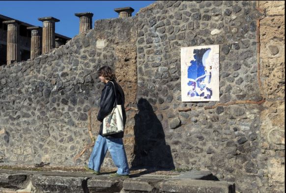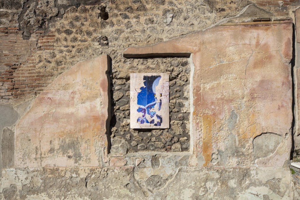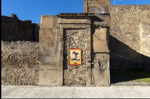 | Credits: Allison Katz, Pompeii Circumstance (Milk glass), 2023, artist’s poster shot in situ at the Archaeological Park of Pompeii, January 2023, Photo Amedeo Benestante. Courtesy the Artist and the Archaeological Park of Pompeii |
