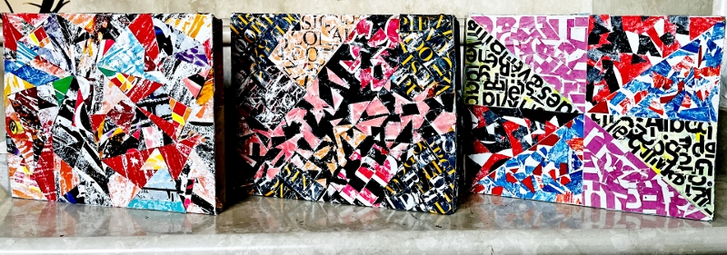 In 2020, in full lockdown, for my project “LACER / ACTIONS”, I created three collages on a wooden tablet, made with the waste paper of decomposed advertising posters. The three works were a tribute to the artistic phenomenon of vorticism. Now, on the back side of the same tablets, I have composed other collages, always using small scraps of waste paper, residues of advertising posters hung on outdoor billboards. In this series of images, here are the three collages created on the back of the tablets dedicated to vorticity. I called them “Clouds / Cloud”. SIZES: 24,5 X 21 CMS.