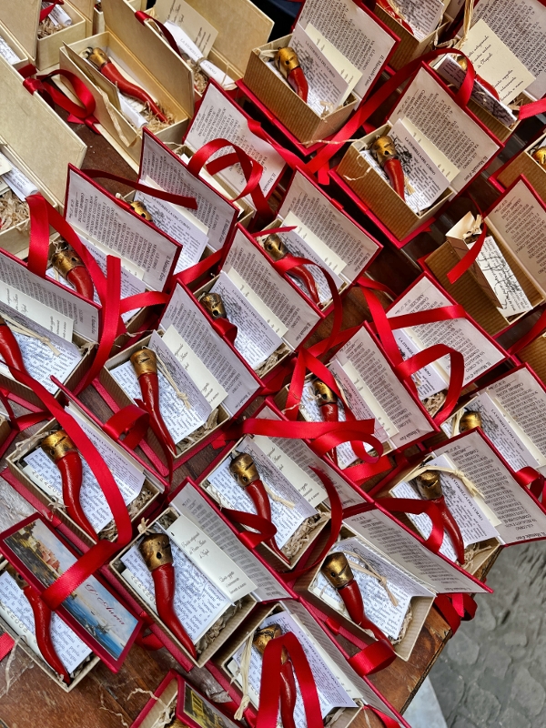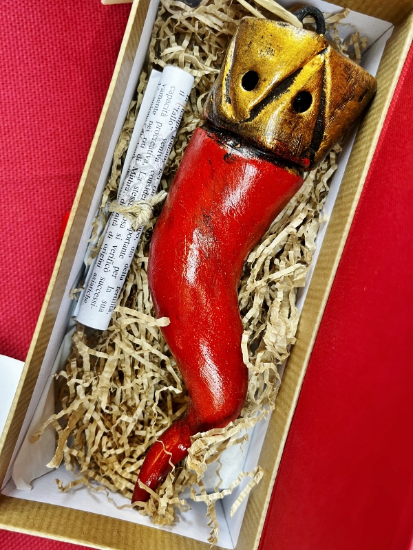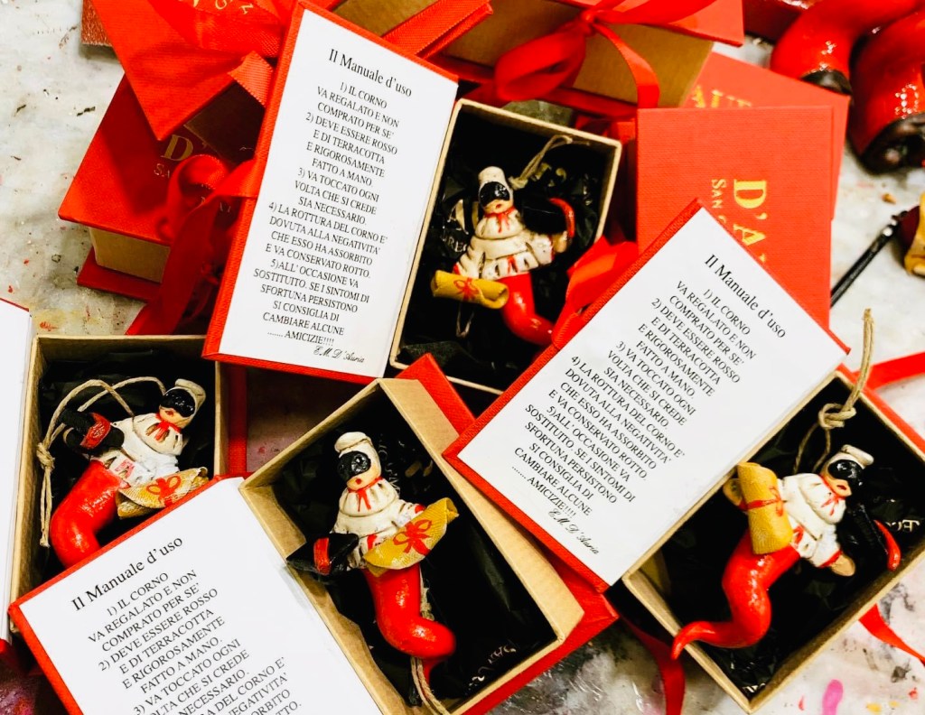 For example, in via San Biagio dei Librai – a few steps from San Gregorio Armeno street – the D’Auria family proudly produces horns of high quality, with guaranteed and special materials that respect the canons of tradition. But not only that: it is one of the shops that best expresses the Neapolitan art of the nativity scene. It is easy to see the D’Aurias at work, beyond the sales counter and in the workshops located nearby. A passion handed down over time and which shines in a vast range of traditional Neapolitan objects, from the “scarabattoli” (beautiful nativity scenes in glass and wooden cases) right up to the red horns, handmade and presented in various shapes. Because the “curniciello”, in Naples, is a playfully serious matter, however one thinks about lucky charms. As the great actor Peppino De Filippo said, “it’s not true, but I believe it”. A phrase that is worth a treatise on human philosophy, as well as being the brilliant title of one of his extraordinary theatrical works (and if you want to participate in the game, rub the little red horn in the photo too).