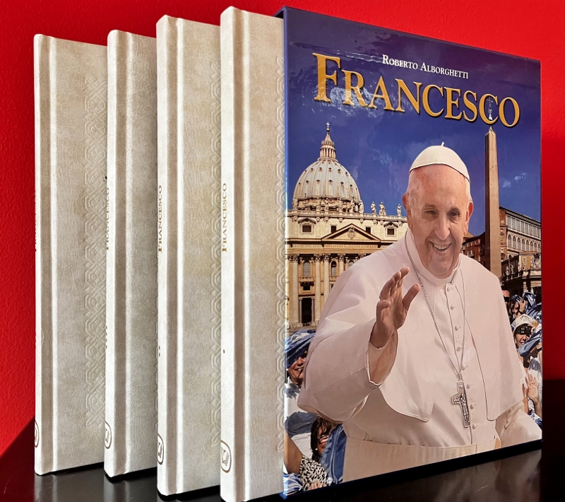 10 anni esatti dalla sua prima edizione – e nel decennale del pontificato di Jorge Mario Bergoglio – Velar ripropone “Francesco”, la prima grande biografia illustrata sul primo Papa del Continente latinoamericano. Ne è autore Roberto Alborghetti, giornalista, scrittore, fotoreporter e formatore. La prefazione è autorevole: è scritta dal Cardinale Giovanni Battista Re, decano del Sacro Collegio cardinalizio al momento dell’elezione di Papa Francesco. L’edizione speciale si presenta con un cofanetto contenente quattro volumi in grande formato, con copertina in pelle bianca. “Francesco” è un’opera unica, che non ha eguali. Si articola in ben 500 pagine, con un apparato fotografico di eccezione: oltre 550 le fotografie che ricostruiscono il percorso umano e pastorale di Papa Francesco.