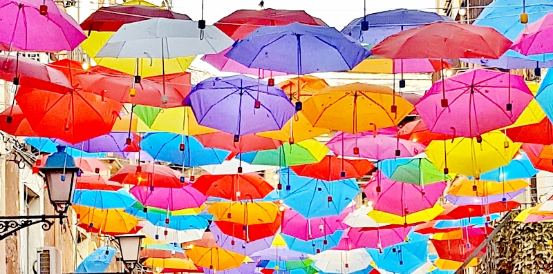A shower of umbrellas in the heart of Catania. As if to contrast with the dark colors of the stones of the buildings and the pavement – pure lava rock, taken from the flanks of Etna, the mother mountain of Sicily for centuries – in some historic streets, close to the monumental center, here is a parade of multicolored umbrellas, stretched out almost to protect people and things.