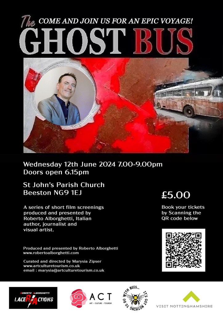 This is it! The official flyer/poster for The Ghost Bus Night Show 12th June 7-9pm at St. John’s Parish Church Beeston Nottingham (UK). You find on it the Eventbrite QR code embedded. The Mayor of Broxtowe Councillor Sue Paterson and her Consort will be officially attending. The event is curated and directed by Marysia Zipser – Art Culture Tourism https://www.artculturetourism.co.uk/ marysia@artculturetourism@co.uk.