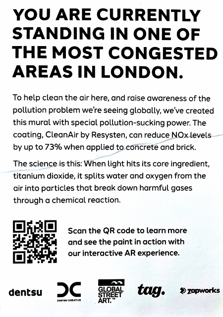 The text written on the white sheet states that “to help clean the air here, and raise awareness of the pollution problem we’re seeing globally, we’ve created this mural with special pollution-sucking power. The coating, CleanAir by Resysten, can reduce NOx levels by up to 73% when applied to concrete and brick. The science is this: when light hits its core ingredient, titanium dioxide, it splits water and oxygen from the air into particles that break down harmful gases through a chemical reaction”.