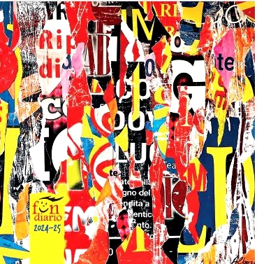 Here is “Shattered Words”! It’s a collage (sizes: 57×43 cms) I created for my Lacer/actions project using hundreds of pieces of waste paper of advertising posters. The image was chosen for the new FUNDIARIO, “the strongest Italian school diary that exists” published by Funtasy Editrice. FUNDIARIO is distributed in many Italian schools and the next year the theme of the content is “Let’s play with words”. In the photos: the original collage and the cover of FUNDIARIO.