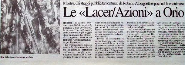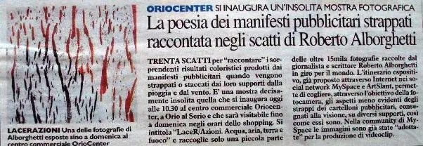 Proprio in questi giorni – il 16,17 e 18 Luglio 2010 – le mie macro fotografie di “Lacer/azioni” andavano in mostra presso l’avveniristica cornice di Oriocenter, uno dei più grandi e visitati centri commerciali d’Italia. Gli artworks (erano fotografie, non dipinti come invece quasi tutti pensavano!) erano collocati sullo sfondo dell’aeroporto di Milano-Bergamo Orio e del profilo di una delle più belle città italiane, Bergamo Alta. Grande il successo di pubblico – circa 30 mila i visitatori – e di critica per queste mie insolite macro-immagini catturate in giro per il mondo osservando la carta della pubblicità strappata e gli elementi naturali decomposti e corrosi dal tempo e dall’ambiente. Aveva molto colpito anche lo stile dell’installazione: le opere erano appese a pannelli per recinzioni mobili utilizzati a protezione dei cantieri edili. Volevamo in effetti dare l’idea di un progetto in pieno sviluppo, aperto sempre ad ogni soluzione. Ne parlarono anche i giornali, sottolineando la particolarità e l’originalità del progetto che è sempre in evoluzione: ha ora raggiunto quota 170.000 immagini raccolte in vari angoli del Pianeta. #laceractions #oriocenter #streetphotography #macrophotography #exhibition #mostre #bergamo