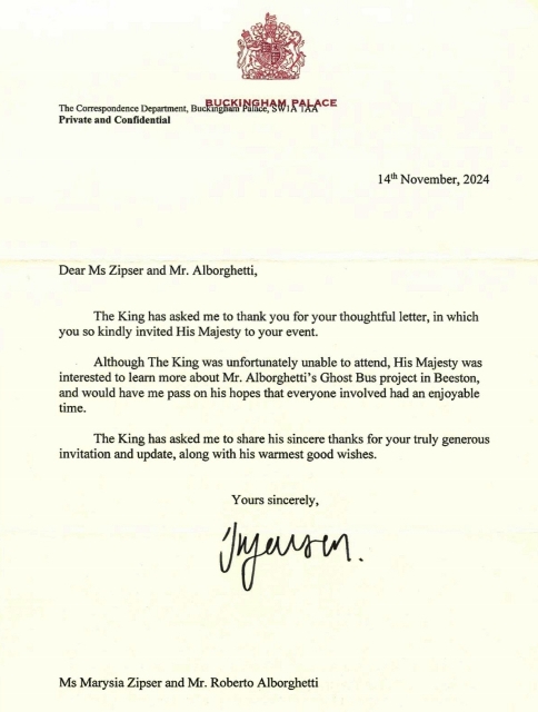 THE GHOST BUS: L’INTERESSE DI RE CARLO IN UNA LETTERA DA BUCKINGHAM PALACE
