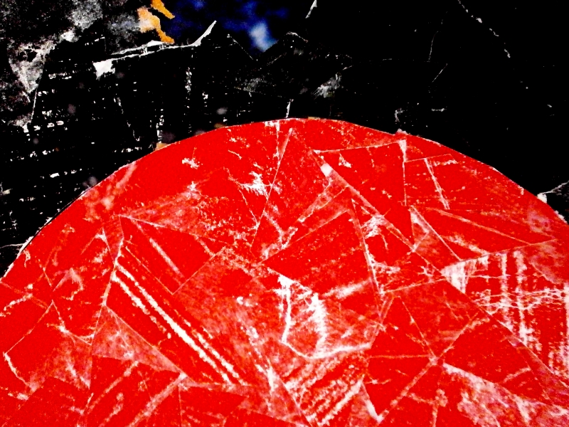 “Blood Moon” (the Red Moon), Collage made of waste paper of decomposed publicity posters. Created on a round table, diameter 79 cms. Lacer/action project by Roberto Alborghetti