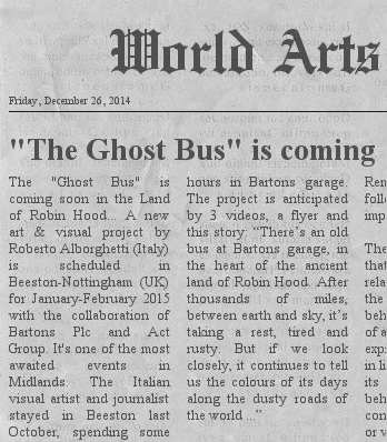 “The Ghost Bus” is coming soon in the Land Of Robin Hood… A new art and visual project by Roberto Alborghetti  – Italian journalist, writer and visual artist – is scheduled in Beeston-Nottingham (UK) for January-March 2015 in collaboration with Bartons Plc and its owner Simon Barton, ACT Group (Art-Culture-Tourism) and its founder Marysia Zipser. The Italian visual artist and journalist stayed in Beeston last October, spending some hours in Bartons huge garage of vintage buses and cars.